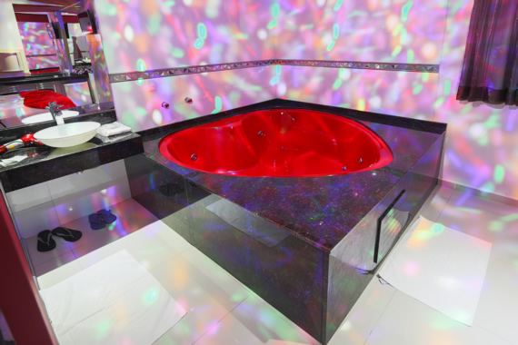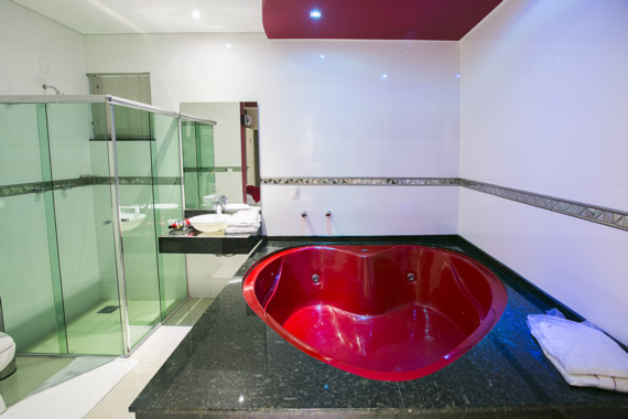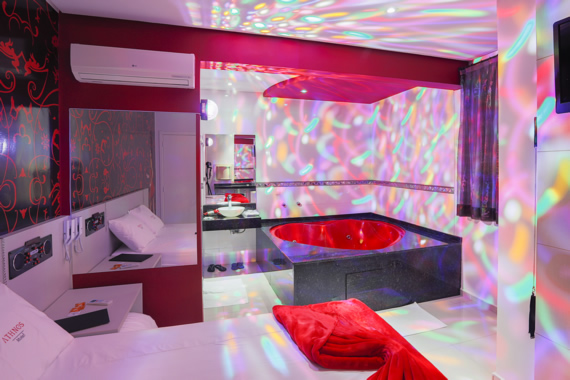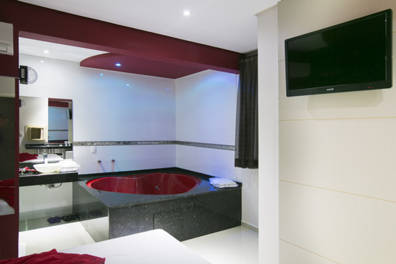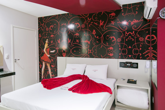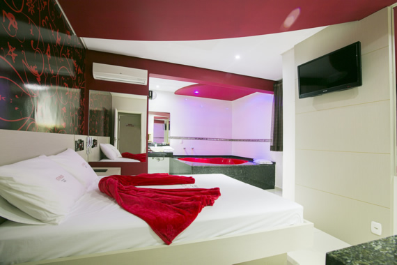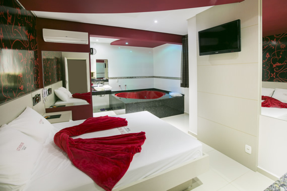 Uma suíte com decoração romântica, tudo preparado para os casais viverem intensamente seus momentos de prazer.